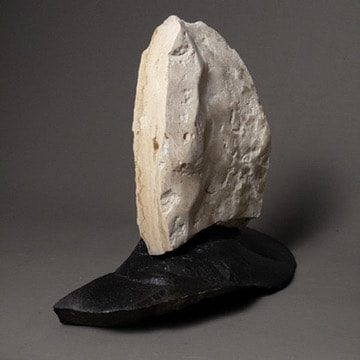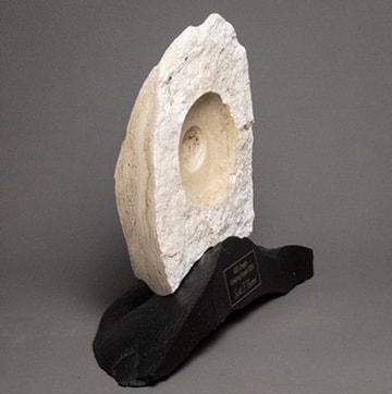 This sculpture features a piece of caliche-cemented Missoula flood sediment on a base of Columbia River Basalt. The caliche was collected in the Columbia River gorge near Rufus. It is surprisingly dense and hard, and has complicated internal layering which I tried to reveal by carving out the “eye” and shaping and polishing the edges. The basalt comes from a quarry in Biggs Junction, excavated in an unusually thick flow of the Sand Hollow basalt of the Frenchman Springs Member of the Wanapum Basalt. The base of this hundred-meter-thick flow is dense, black, phonolitic, and breaks with a conchoidal fracture, producing interesting textures on the broken surface. When polished with a diamond brush, it takes on an almost vitreous luster.