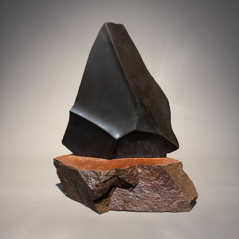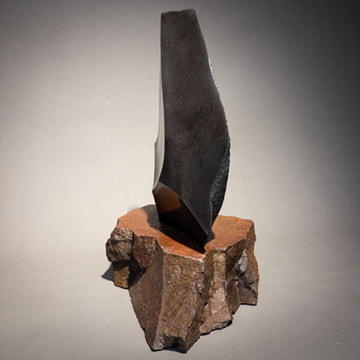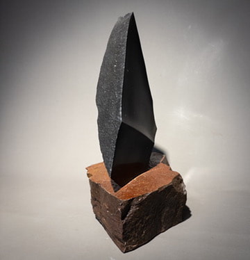 Columbia River Basalt from Sherman County, Oregon on a base of quartz and iron-infused mudstone from Crook County. This basalt comes from a quarry, where large blocks of very dense basalt were heaped up, and small pieces flaked off as the blocks were jumbled together. The density of the basalt results in interesting fracture patterns on the broken surfaces, and the stone takes an almost vitreous luster when brushed or polished. This fragment had the natural shape of an arrowhead.