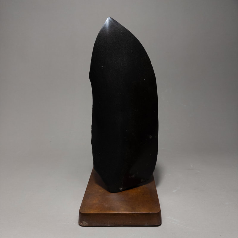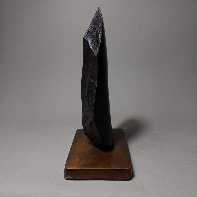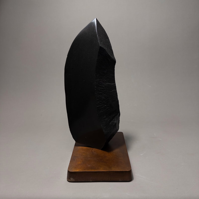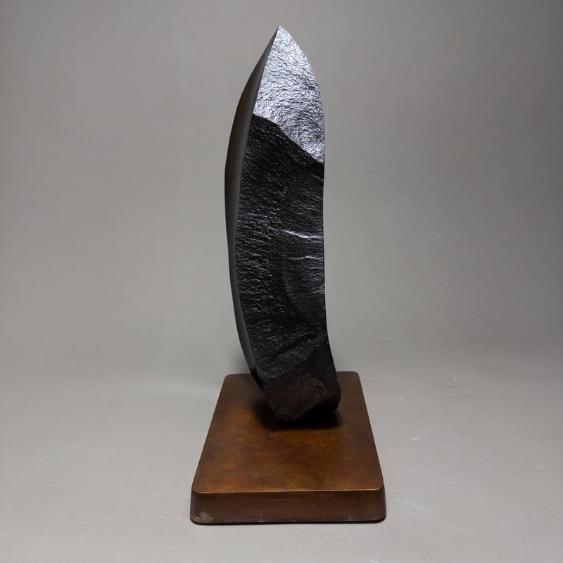 Columbia River Basalt from Wasco County, Oregon on a base of scrap steel. This basalt is from the bottom of a lava flow that is 300 feet thick despite being 150 miles from its source. The rock is unusually dense and black because of the pressure it was under as it cooled, giving it a nearly metalllic finish when polished. The natural shape of this piece reminds me of a wing, a feather or a leaf, depending on the orientation The trailing edge of the wing shape is quite sharp.