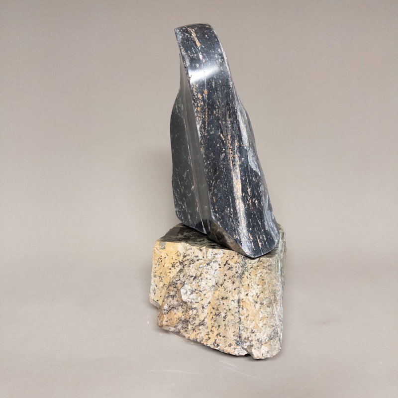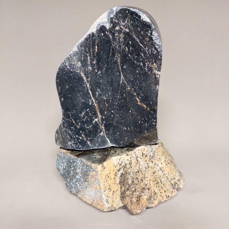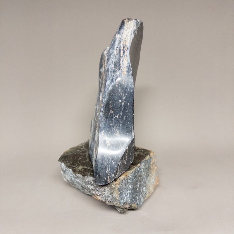 This Timestone is made of blueschist, a rare rock that forms in subduction zones where ocean crust sinks deep into the mantle only to rapidly return to the surface in the chaos of mixed and broken rock that forms where plates collide. The rapid journey to unfathomable depths changes black basalt into a layered rock studded with blue glaucophane and tiny red garnets.
