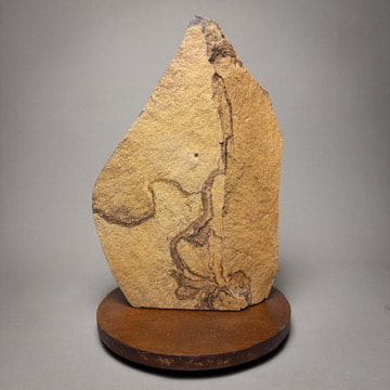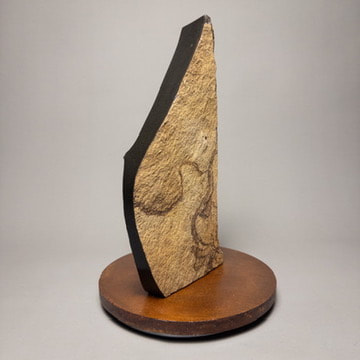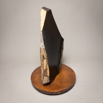 Columbia River basalt shard from Sherman County on a base of patinated scrap steel. Like many of my basalt pieces, I have preserved the original shape and smoothed and polished a few of the facets to show the dark interior that lies just beneath the surface. The natural jointing turns the bedrock into a complex 3D puzzle, and as erosion brings the stone near the surface of the earth, the joints open slightly, allowing groundwater to percolate through the rock, leaving a weathering rind on the joint surfaces. Erosion eventually frees the stone for me to find, usually in a ditch alongside the road.