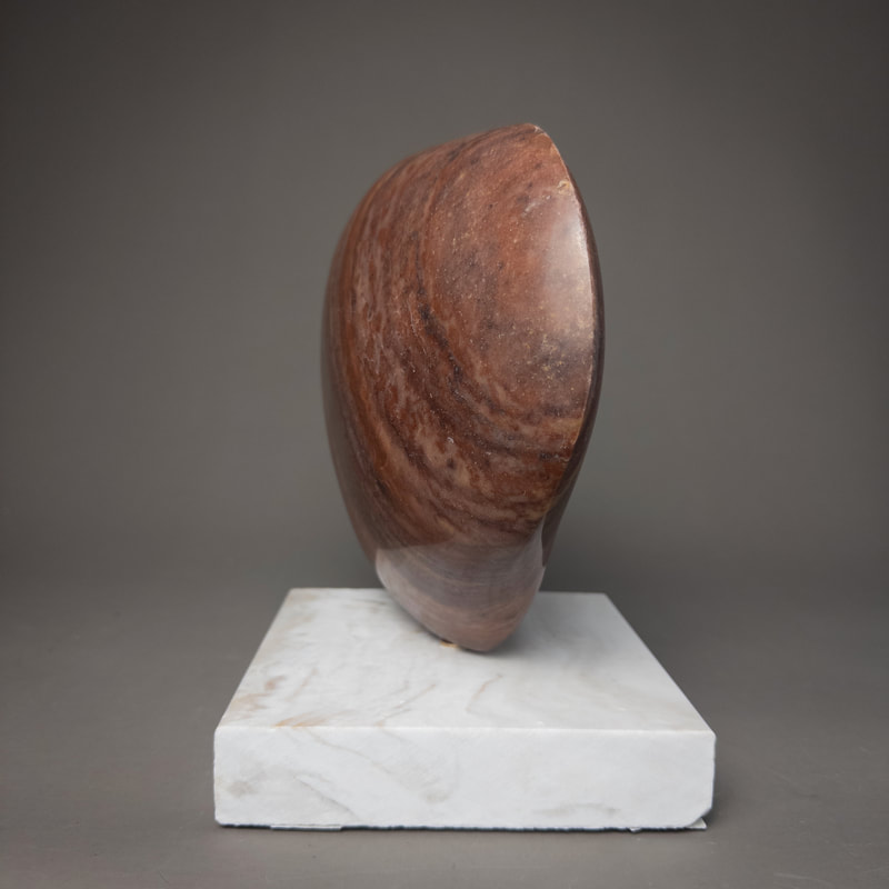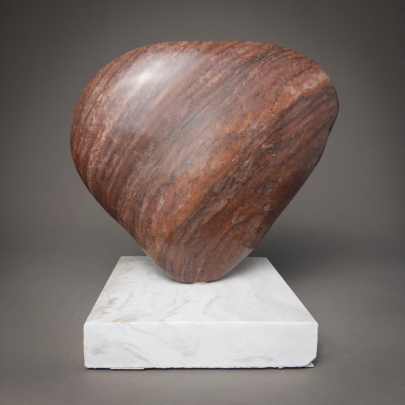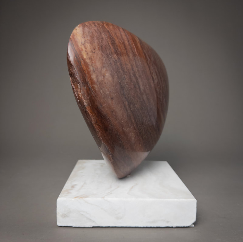 Quartzite from Colorado on a base of marble countertop scrap. This rock first formed as sandstone composed of grains of quartz sand. Over hundreds of millions of years it was buried deeply in the earth, where the intense heat and pressure caused the quartz grains t recrystallize into a solid mass, preserving some of the fine layering from the original sandstone as colorful bands. This piece was eventually eroded from the bedrock and carried by a river which shaped and smoothed it.