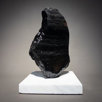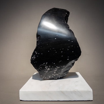 Black obsidian from a rhyolite flow in Harney County, Oregon. Pivoting mount on a base of marble countertop scrap. The rhyolite was flowing slowly before the obsidian cooled, producing the faint layering of lighter colored volcanic glass in this piece.