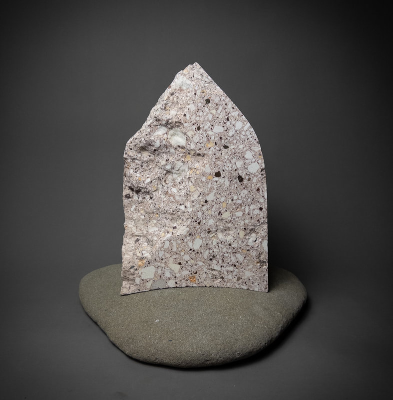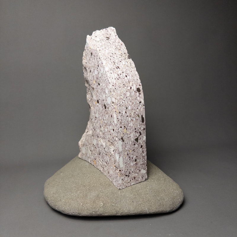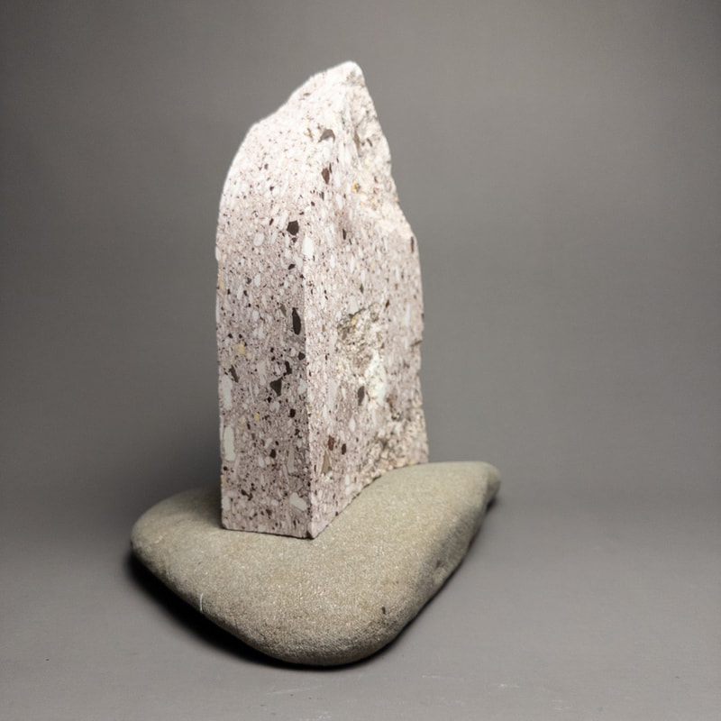 This Timestone is made of tuff, a volcanic rock that formed 40 million years ago when a caldera 8 miles in diameter blasted billions of tons of hot ash, pumice and rock into the sky. The cloud of hot ash rained down around the caldera blanketing the surrounding area with a blizzard of pumice and ash which compacted into a solid rock. The white fragments are pumice and the black are pieces of older rock ripped from the throat of the volcano, both floating in a matrix of pink ash.